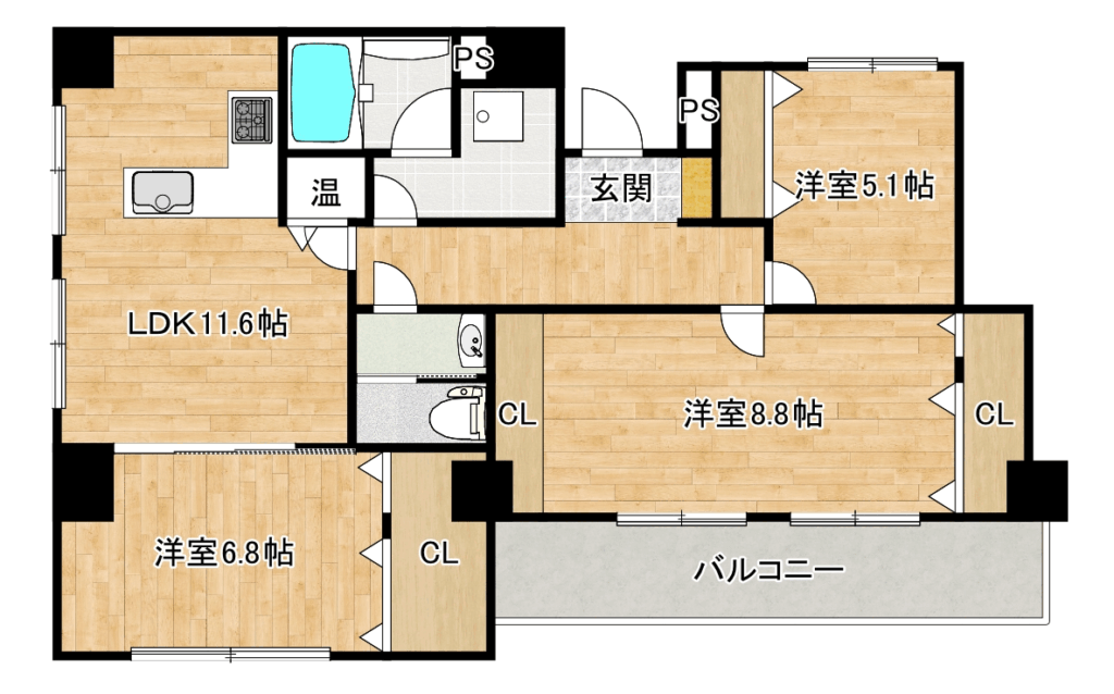 室内フルリフォームマンション・角部屋・L字バルコニー