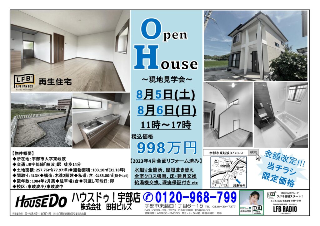 本日はハウスドゥ!宇部店よりリフォーム済み物件の現地見学会開催のお知らせです。