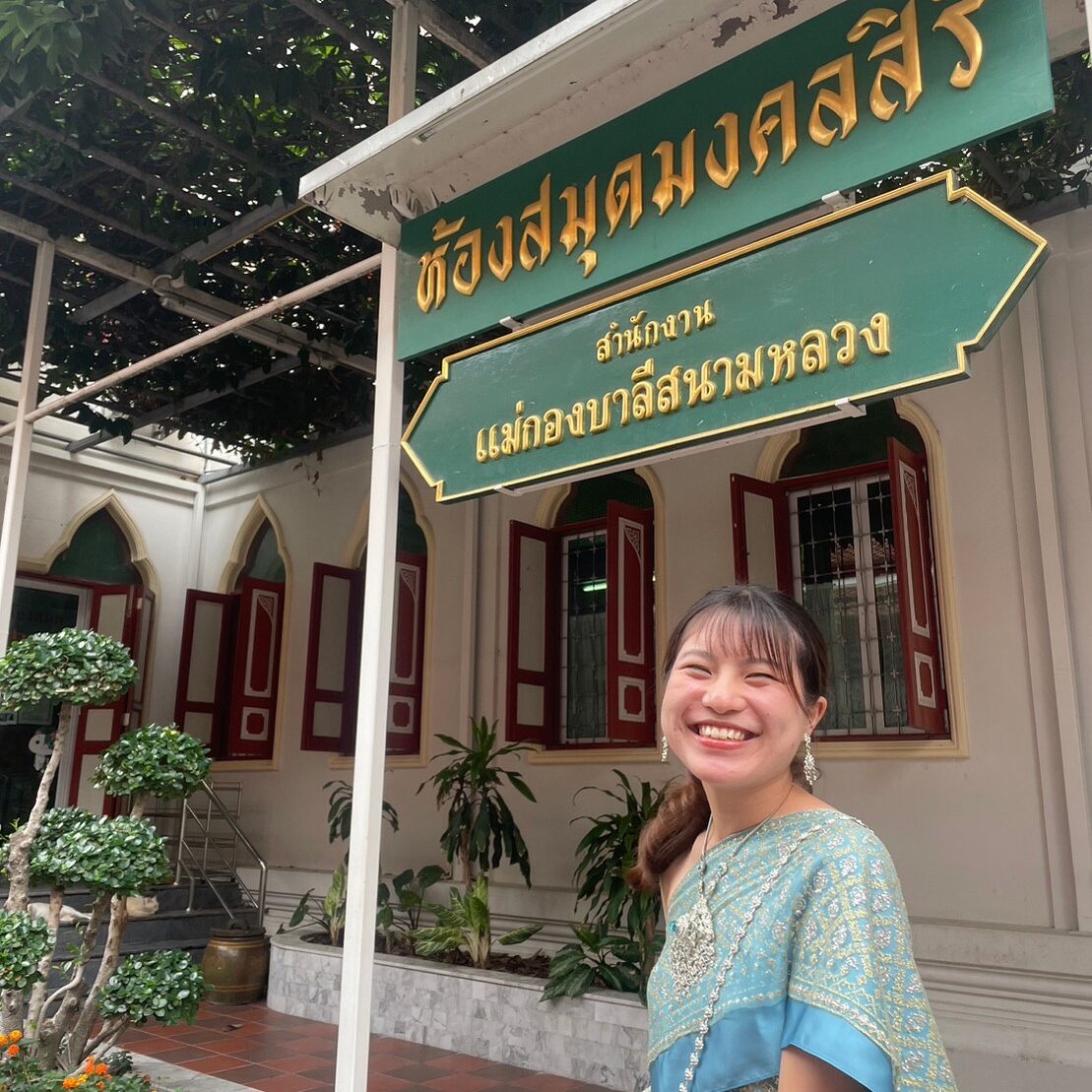 上の写真はタイの民族衣装を着て、寺院に訪れた時の写真です。